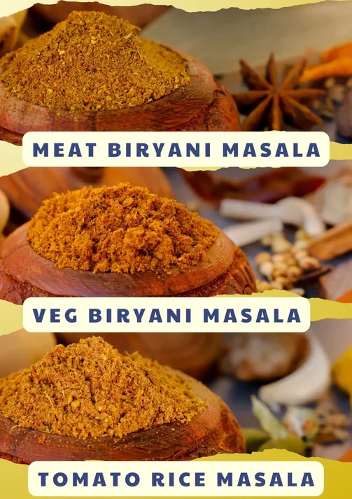 Meat/Non-Veg Biryani Masala: Coriander Seeds, Lemon Salt, Cumin Seeds, Poppy Seeds, Black Pepper, Bay Leaves, Stone Flower, Cloves, Cinnamon, Green Cardamom, Star Anise, Mace, Proprietary Spice Blend